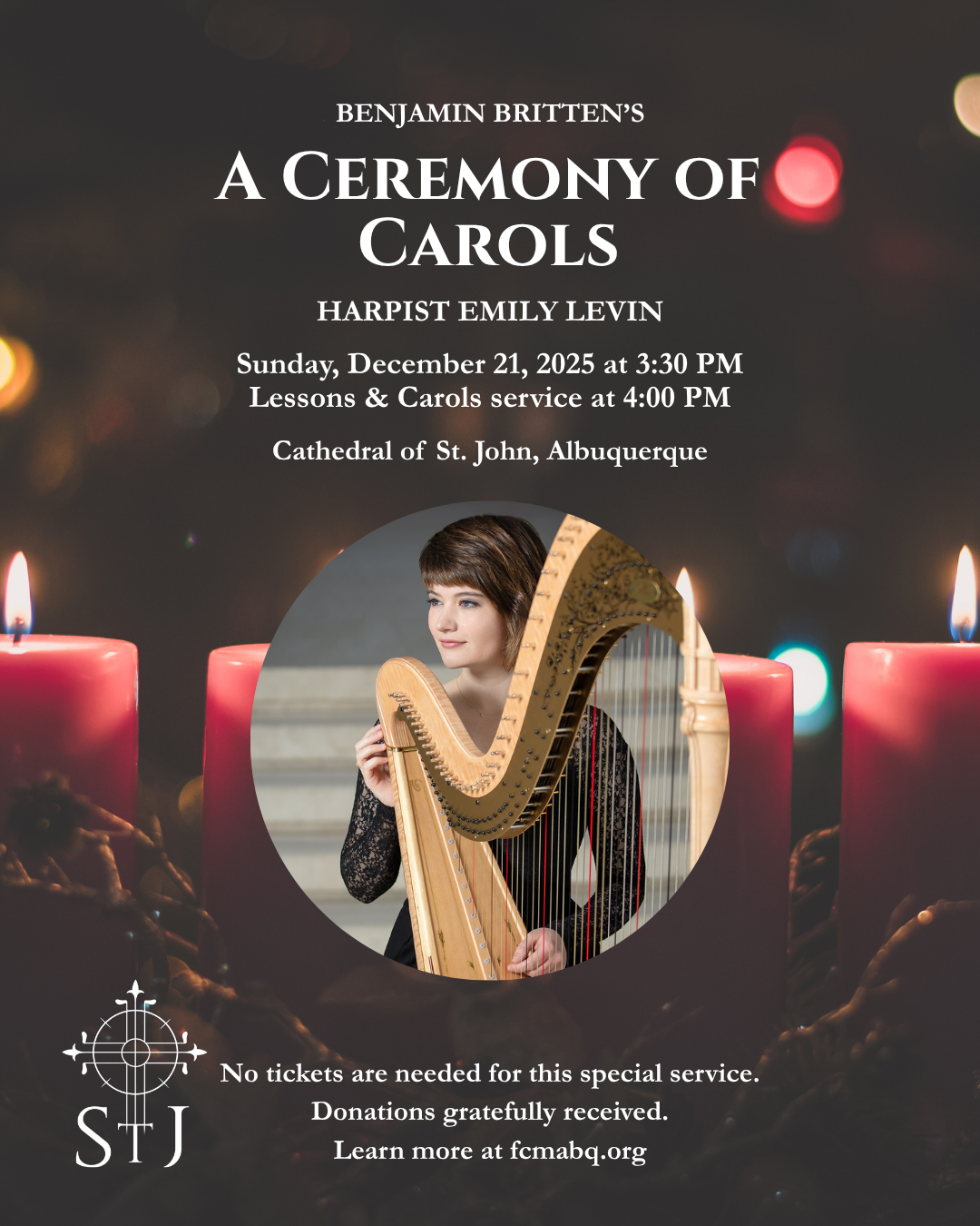 The composer’s beautiful setting of medieval texts creates a unique listening experience—sometimes playful and dance-like, sometimes hushed and reverent, yet deeply moving throughout. Emily Levin, principal harpist of the Dallas Symphony Orchestra, joins the treble voices of the Cathedral choir to bring this magical work to life.